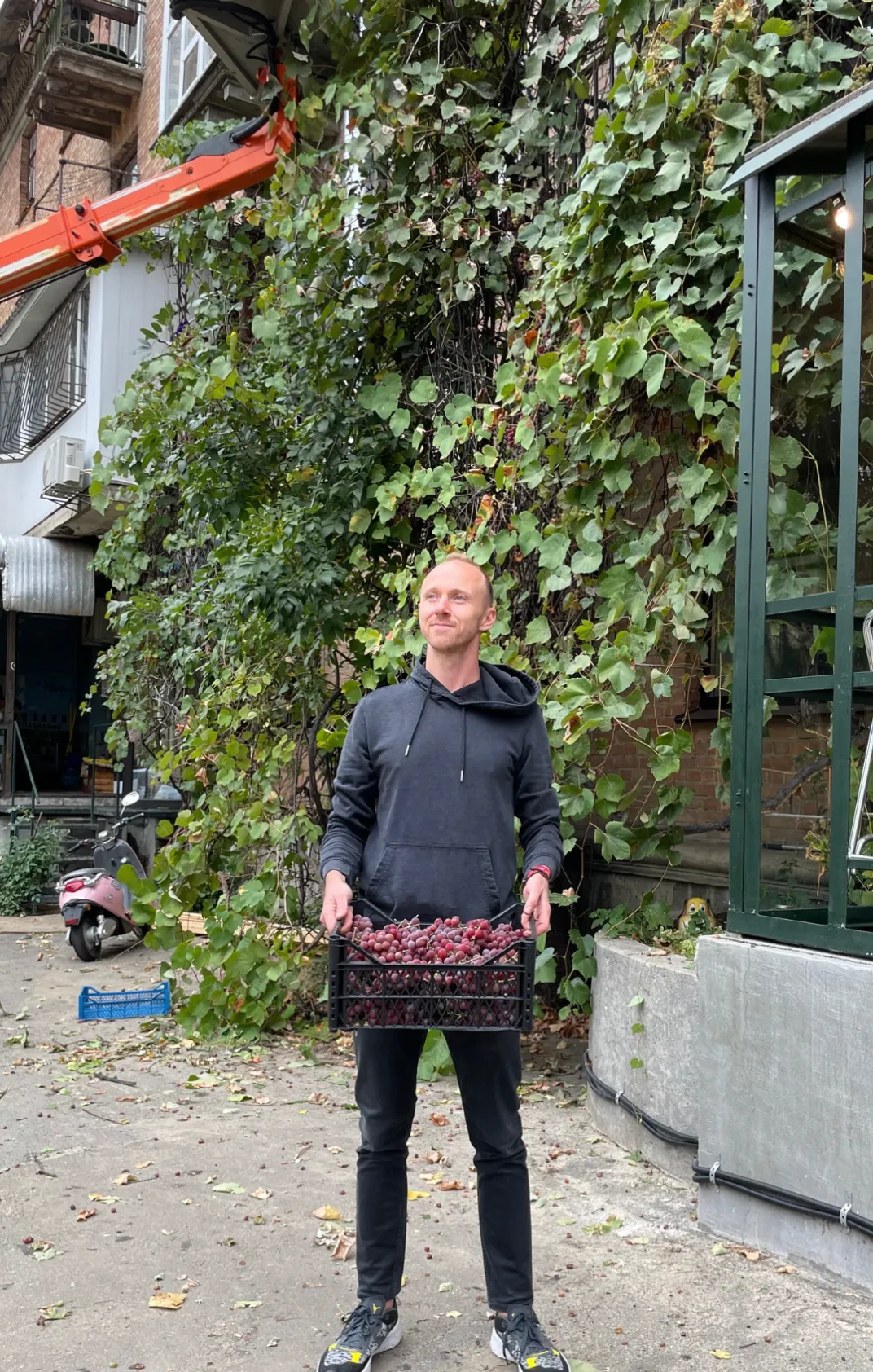 Sergiy went to his favorite restaurant "Dubler" and by a happy coincidence the restaurant building is surrounded by vines on all sides. He talked to the owner and managing partner, got their approval, and wrote a post on social media about his idea with a date when he would be ready to pick up all the grapes that people would gather from the vines in Kyiv and bring them to him.
